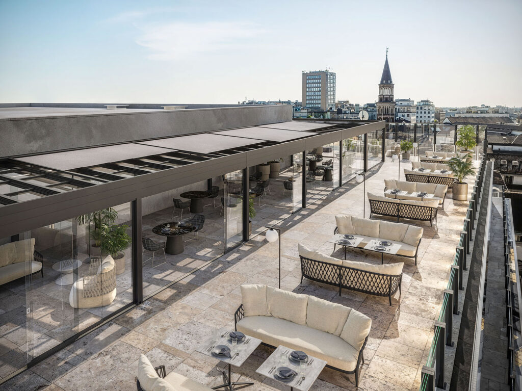Fixed and retractable ALL SEASON roofs, wind barrier systems, telescopic partitions and panoramic glass panels open wide residential and hospitality environments, offering total protection and natural lighting.