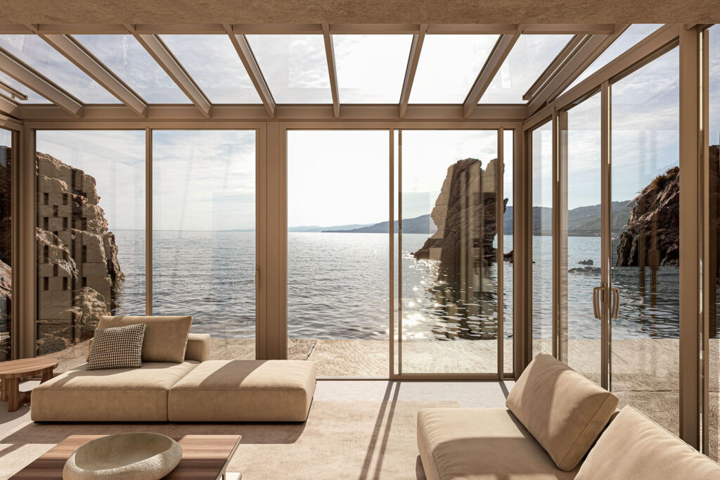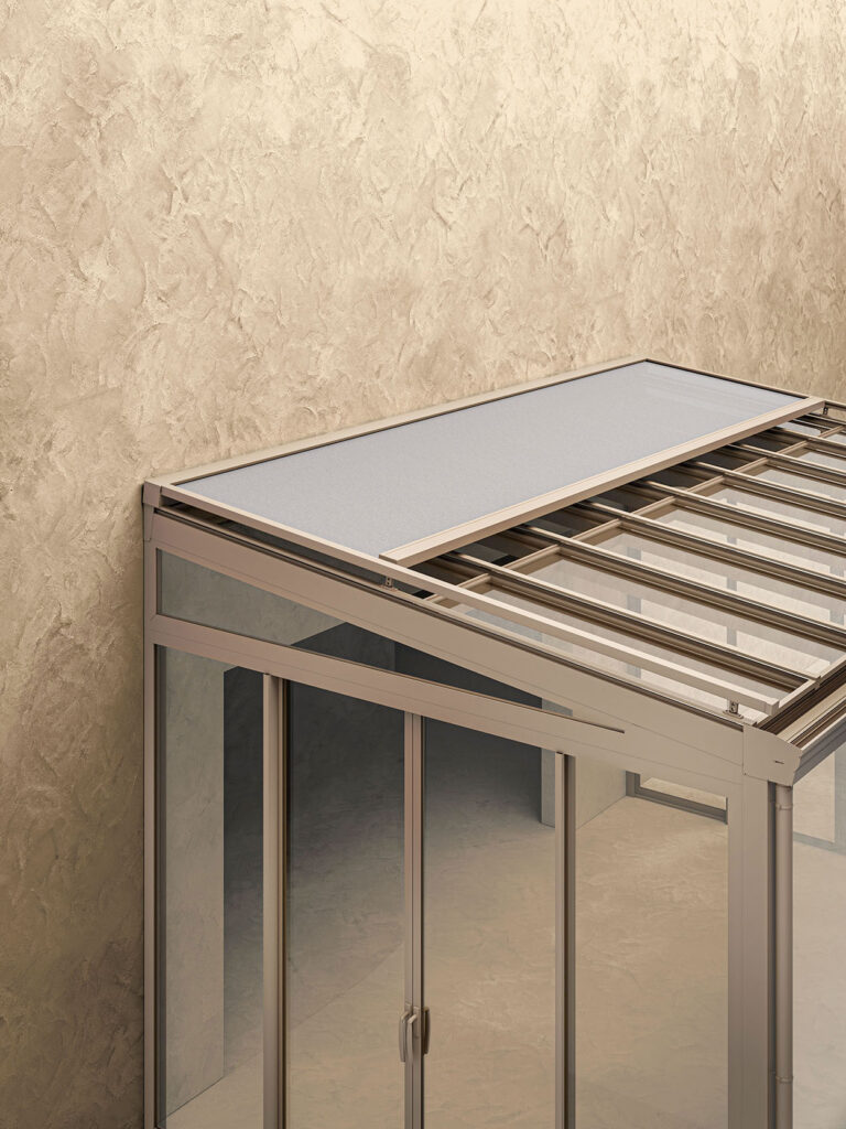 The sloping roof has a clean design, achieved by fixed double-glazed glass panels, for perfect transparency, or – conversely – sandwich panels for a fully blackout option.
