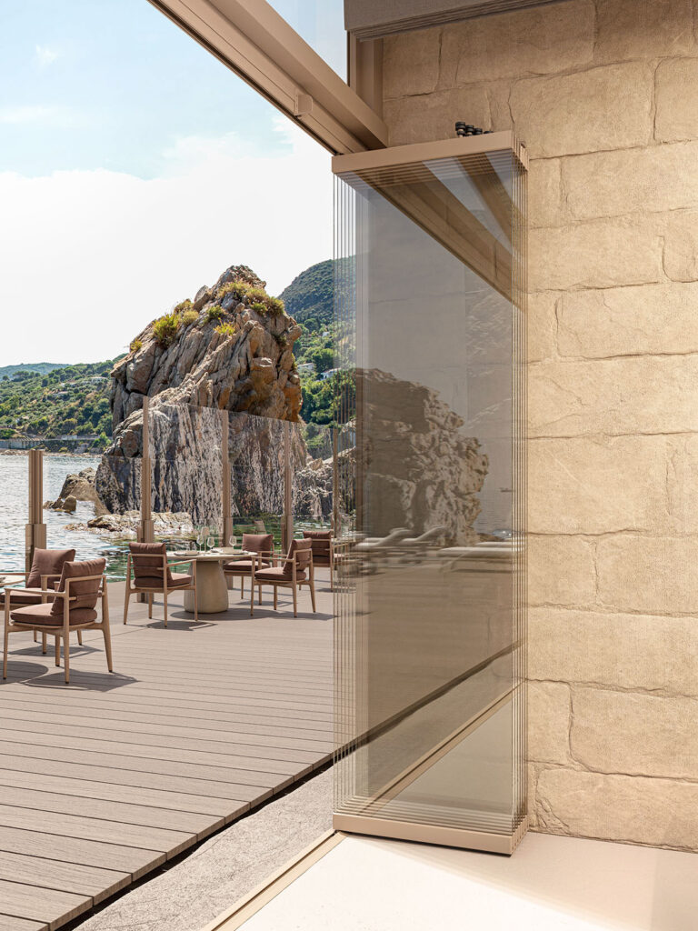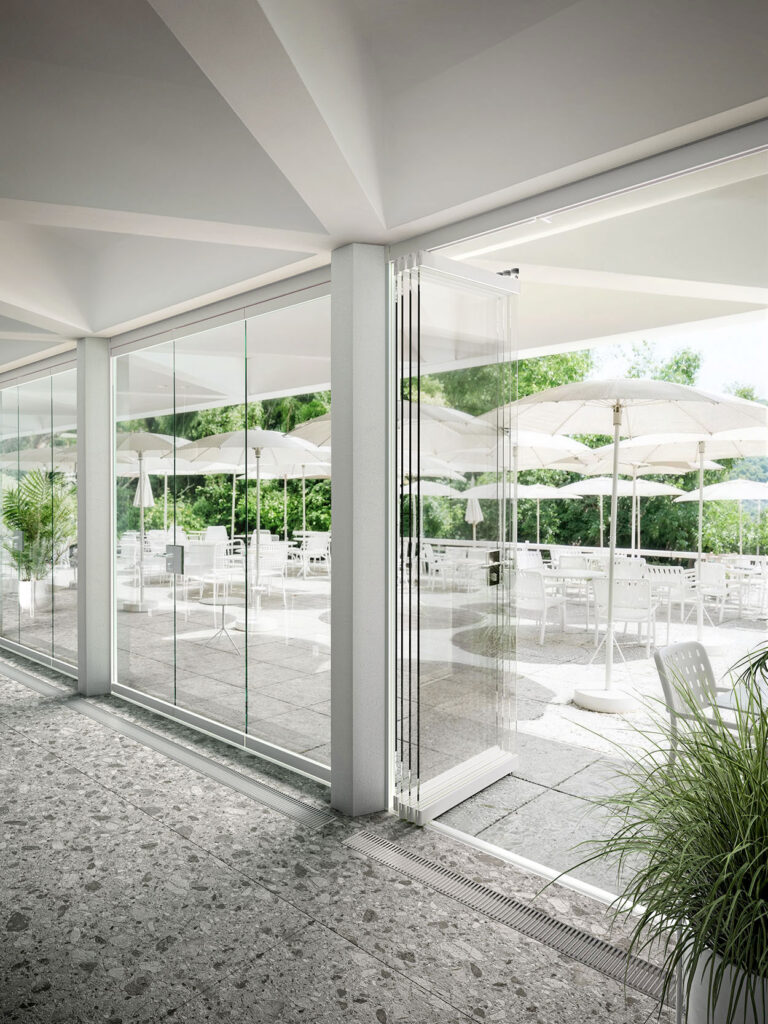 Con un semplice gesto, i pannelli in vetro temperato di Visio Fold ruotano di 90 gradi lateralmente, garantendo un’apertura del sistema fino al 97%. La soluzione più efficace per la chiusura panoramica di portici, attici e balconi che migliorano le proprie performance termiche e acustiche.